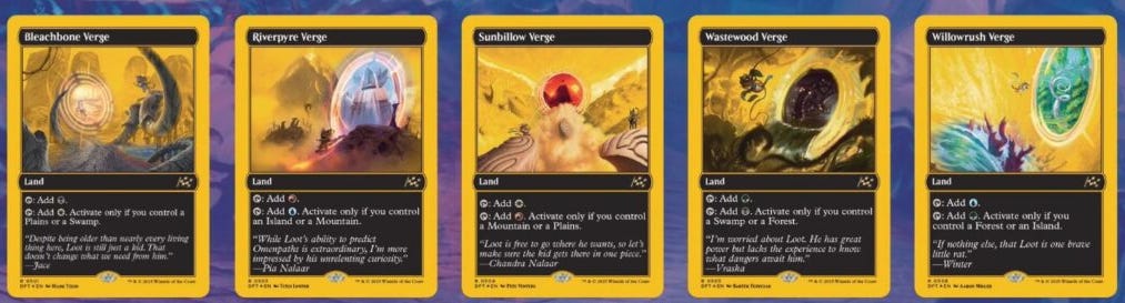 I didn’t mention these lands in my initial article, but they’ve proven solid as they enter the battlefield untapped, which helps decks that want to curve out and I’ve been pleased with them. They’re not staples on the level of the original fetchlands, duals, shocklands but beyond those, there aren’t many must‑have fixes in the land cycles. That makes their inclusion something that a designer can use to nudge archetypes toward the cycles’ particular strengths and weaknesses.