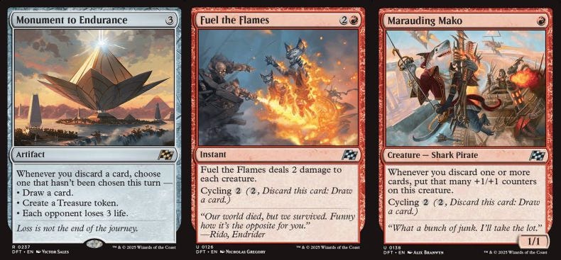 Aetherdrift provided strong payoffs that pushed red toward discard‑centric archetypes via supporting reanimation, madness and more midrange strategies. Historically, that macro‑archetype showed up as Wildfire or “big red,” which often underperformed compared with blue‑based control. Cards like Monument and Mako give red meaningful incentives to play discard synergies, making cards such as Ivora and other discard‑caring pieces more viable.