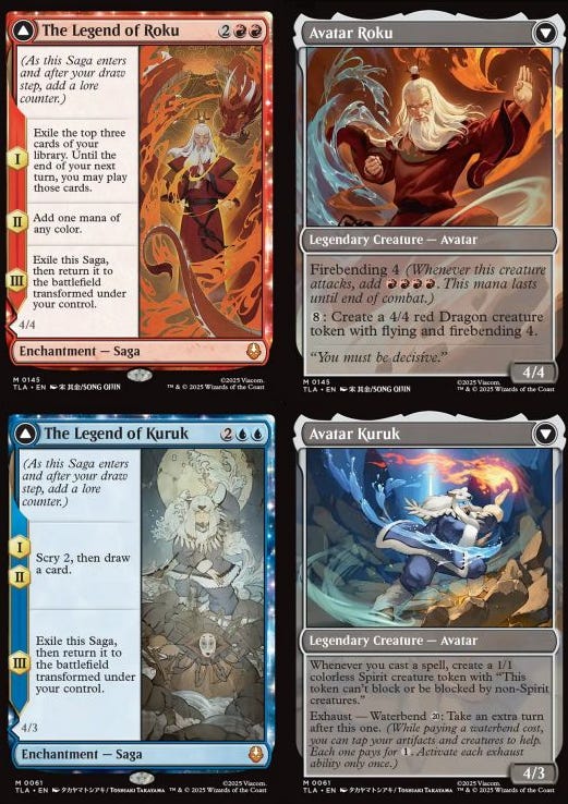 I initially dismissed these as too slow, especially with Legend of Roku inviting comparisons to Showdown of the Skalds, but I underestimated how real their backsides are. Like Fable of the Mirror Breaker, they can’t attack once flipped, yet their transformed sides are decently-sized 4-power threats that initial impressions didn’t fully account for.