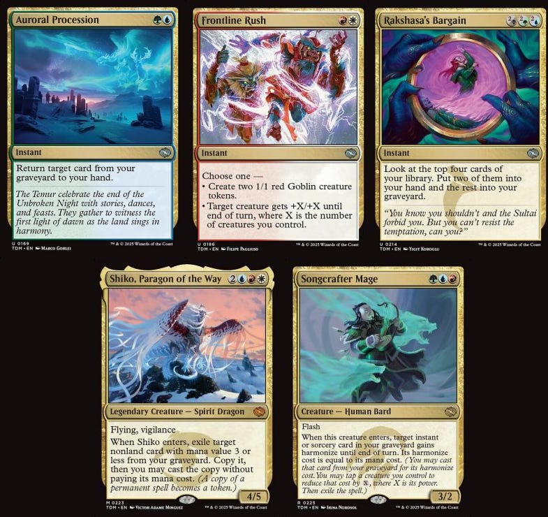 Rakshasa’s Bargain, Songcrafter Mage, Shiko, Paragon of the Way, Auroral Procession, Frontline Rush (-)