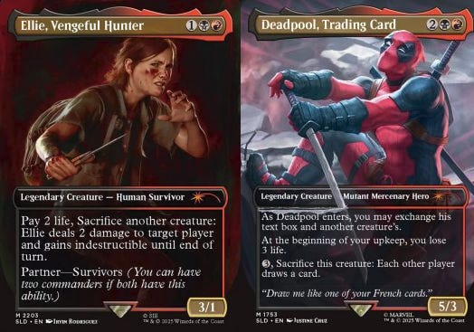 Both of these B/R cards fill a similar role as fast closers. Ellie isn’t limited to once‑per‑turn activations or tied to mana, so when you’re at parity and ahead on life she can end games very quickly. Deadpool excels at disrupting opponents’ threats and reads more like a removal spell that leaves you with a 5/3, where you think of it as a Gilded Drake riff instead of a creature to always play on-curve.