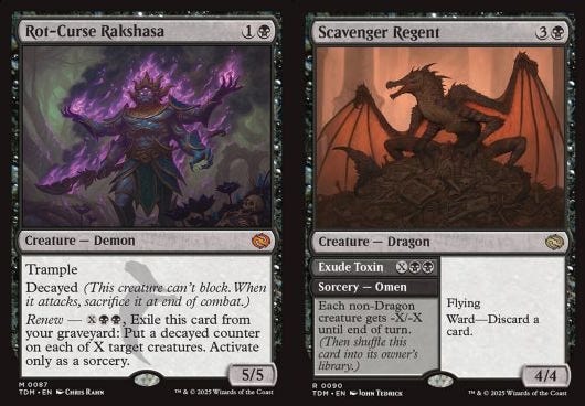 Both of these cards proved rather slow, and neither mode fit the archetypes I had in mind—midrange or aggro. I had higher hopes for Scavenger Regent, but its wrath was too costly and its body was middling, similar to Decadent Dragon, so neither card reached the baseline needed for slower black decks.