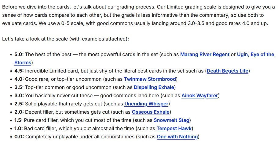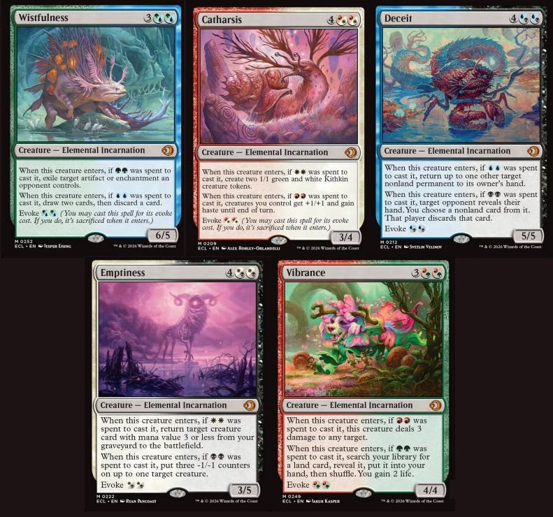 I think I am most excited for Vibrance and Wistfullness. Maybe they end up as middle picks but they are swift army knives on bodies big enough to end the game randomly. Trumpeting Carnisaur has been very popular with my group so I expect good things. Wistfulness is worse but I have plenty of ways to find creature spells and or those creature spells to be artifact/enchantment removal is great The blue mode is bad, but it cycles so its unlikely to be terrible. A 5 mana 6/5 draw three discard 1 is solid in my book. Someone in my group is always trying to pull off field of the dead stuff, probably the biggest target for golas and prime time.